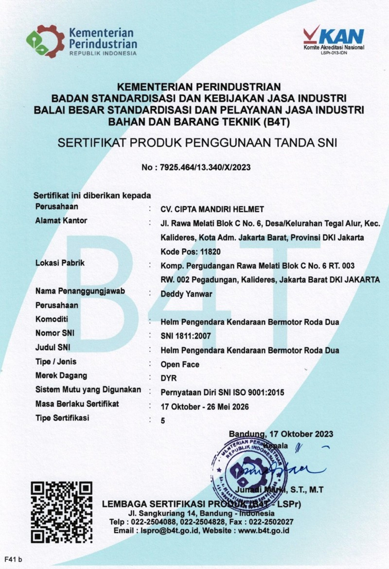CV. CIPTA MANDIRI HELMET melahirkan merk helm yang berkualitas bernama DYR Helmet, seperti tagline yang dimiliki "Provides comfort" memberikan kenyamanan saat berkendara. Kami sangat mengutaman kenyamaan untuk para pengguna helm yang kami produksi.